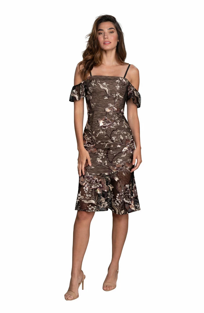 Elaine Dress is sequin embroidered body-con off the shoulder midi dress with a ruffle hem and removable straps.