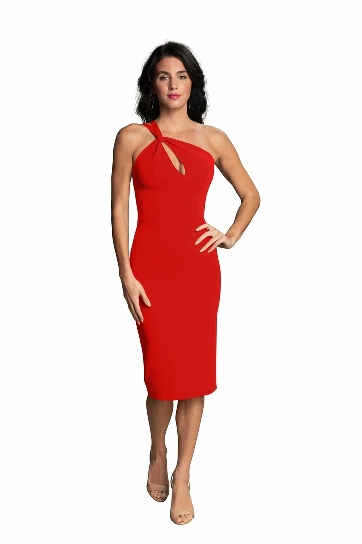 Asymmetrical cutout neckline bodycon midi dress.