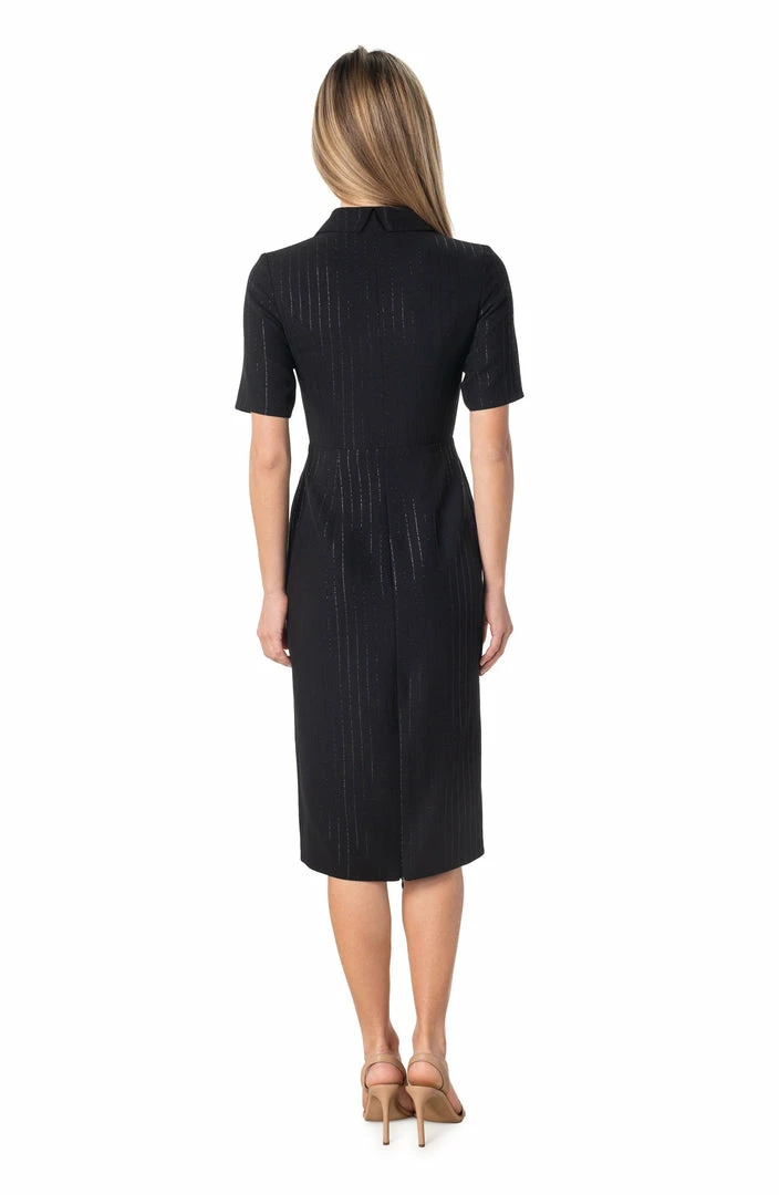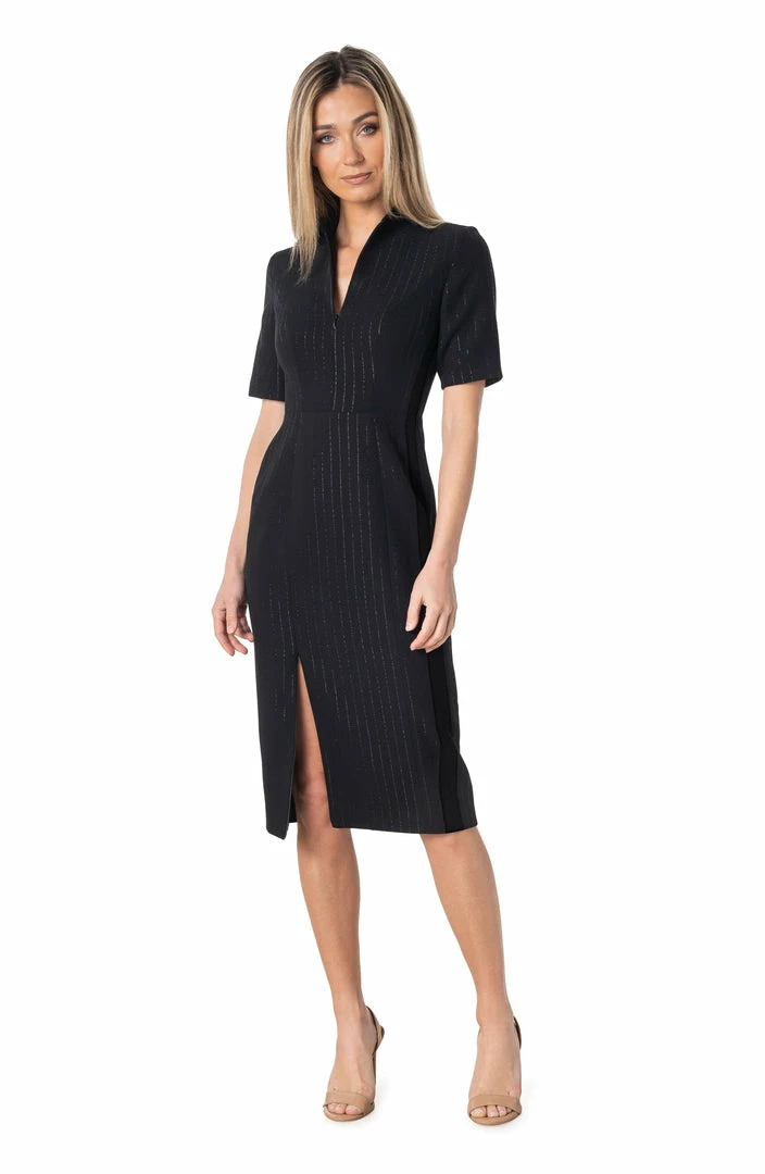 Collared, zip neck, short sleeve, bodycon, midi dress.