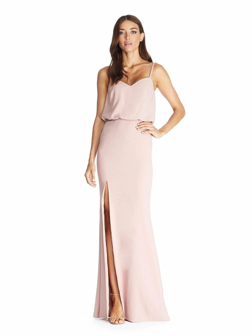 A touch of sophistication, and a touch of sexy our Gracelyn dress in Blush has it all. She features both graceful drape, a high waist silhouette, and finishes with an always alluring thigh-high slit in the gently flared floor sweeping skirt.