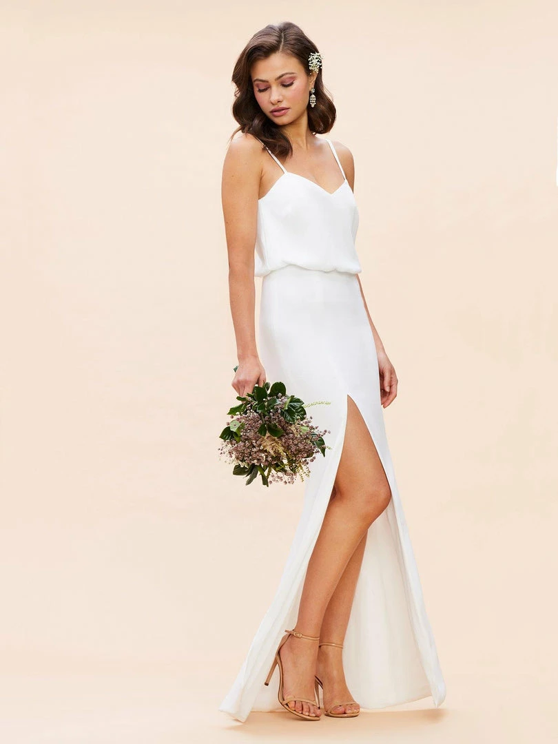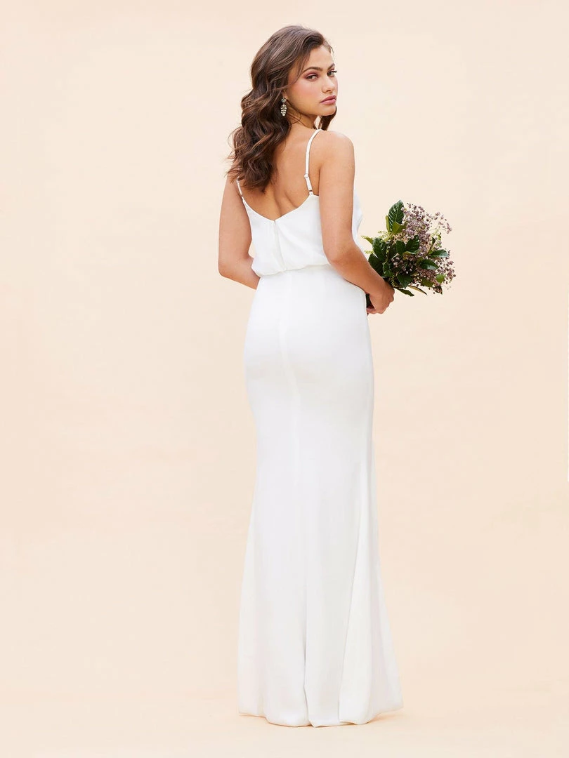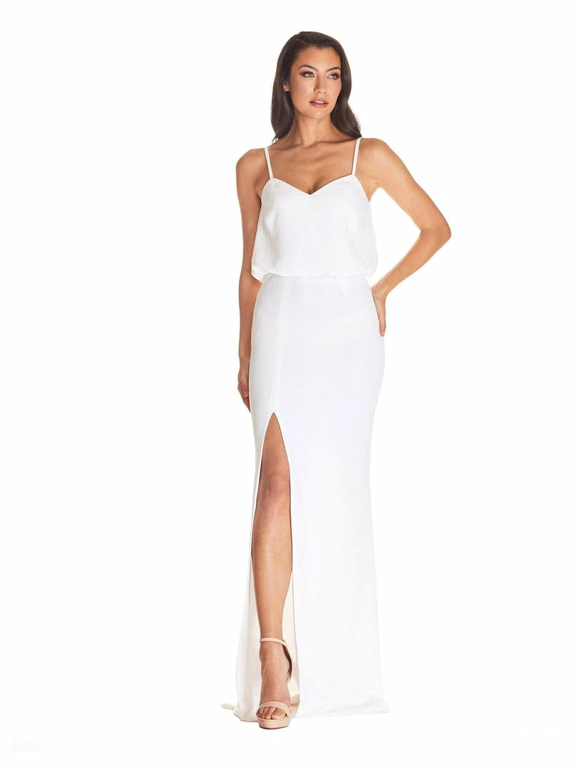 A touch of sophistication, and a touch of sexy our Gracelyn dress in Off White has it all. She features both graceful drape, a high waist silhouette, and finishes with an always alluring thigh-high slit in the gently flared floor sweeping skirt.