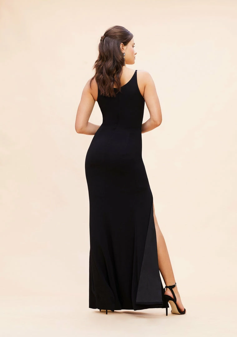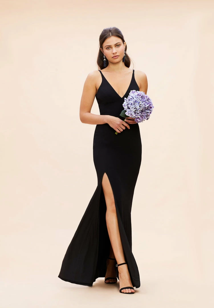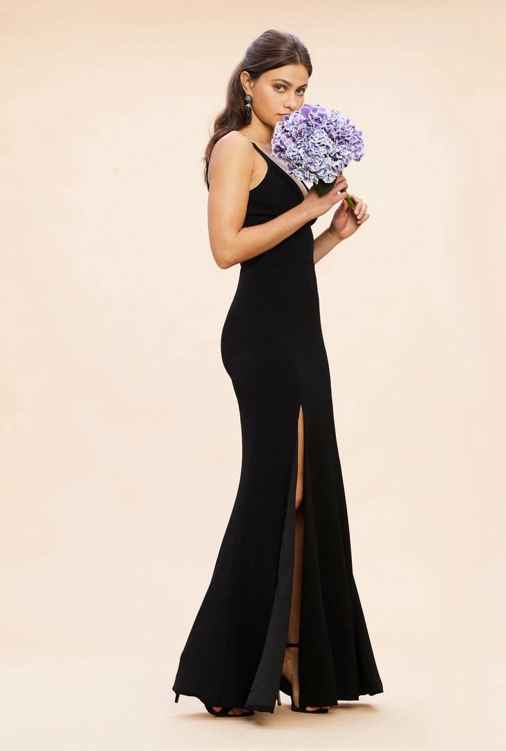 The Iris crepe gown is a body-hugging, floor-length dress with a thigh-high side slit. This sleeveless black gown features thin shoulder straps to highlight a plunging neckline and a deep v-back. The slim gown fits snuggly through the bodice and hips.