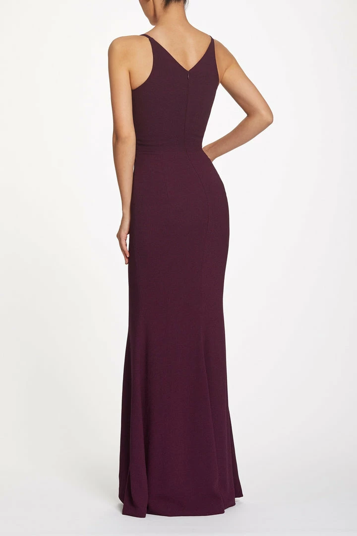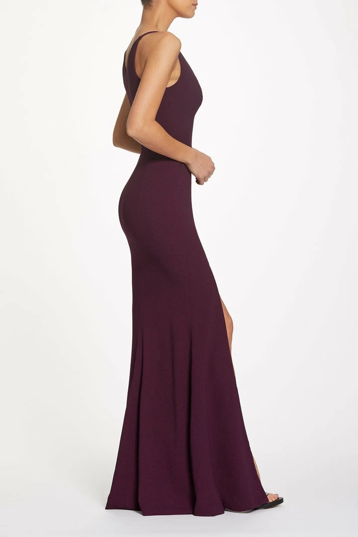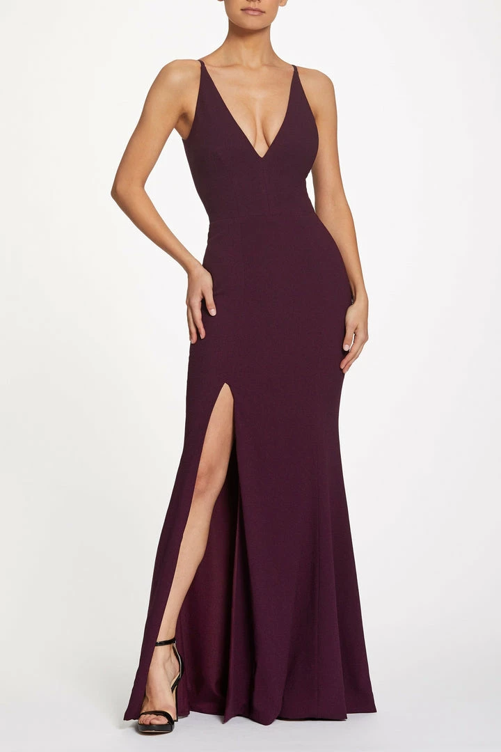 The Iris crepe gown is a body-hugging, floor-length dress with a thigh-high side slit. This sleeveless Plum gown features thin shoulder straps to highlight a plunging neckline and a deep v-back. The slim gown fits snuggly through the bodice and hips.
