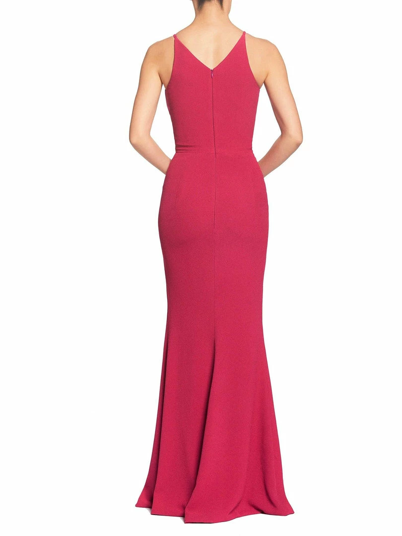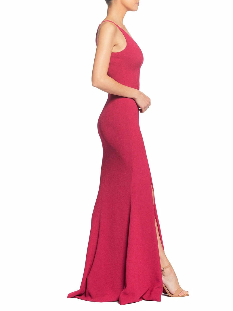 The Iris crepe gown is a body-hugging, floor-length dress with a thigh-high side slit. This sleeveless Raspberry gown features thin shoulder straps to highlight a plunging neckline and a deep v-back. The slim gown fits snuggly through the bodice and hips.
