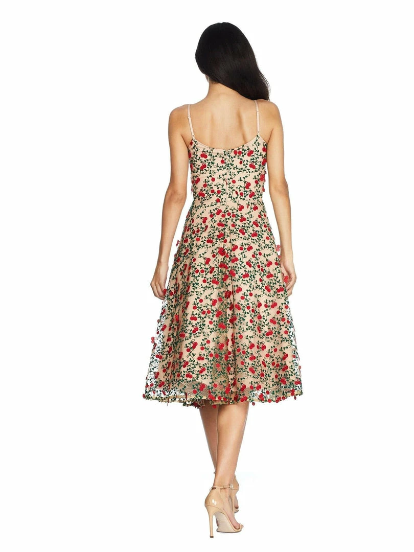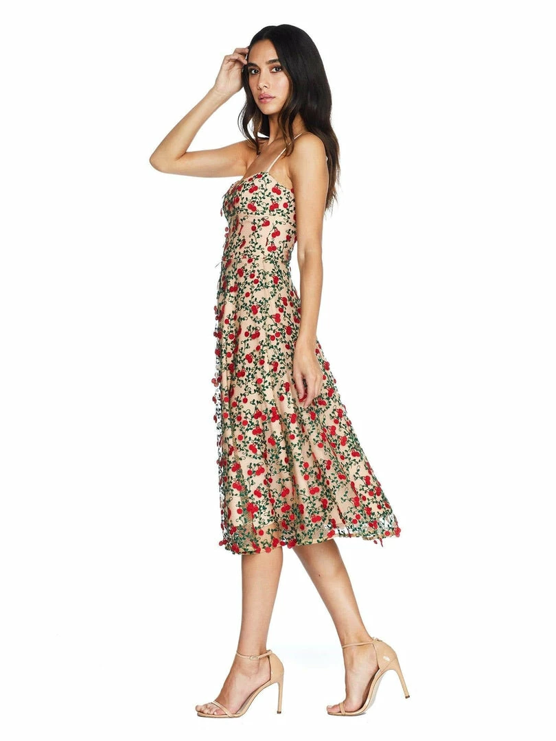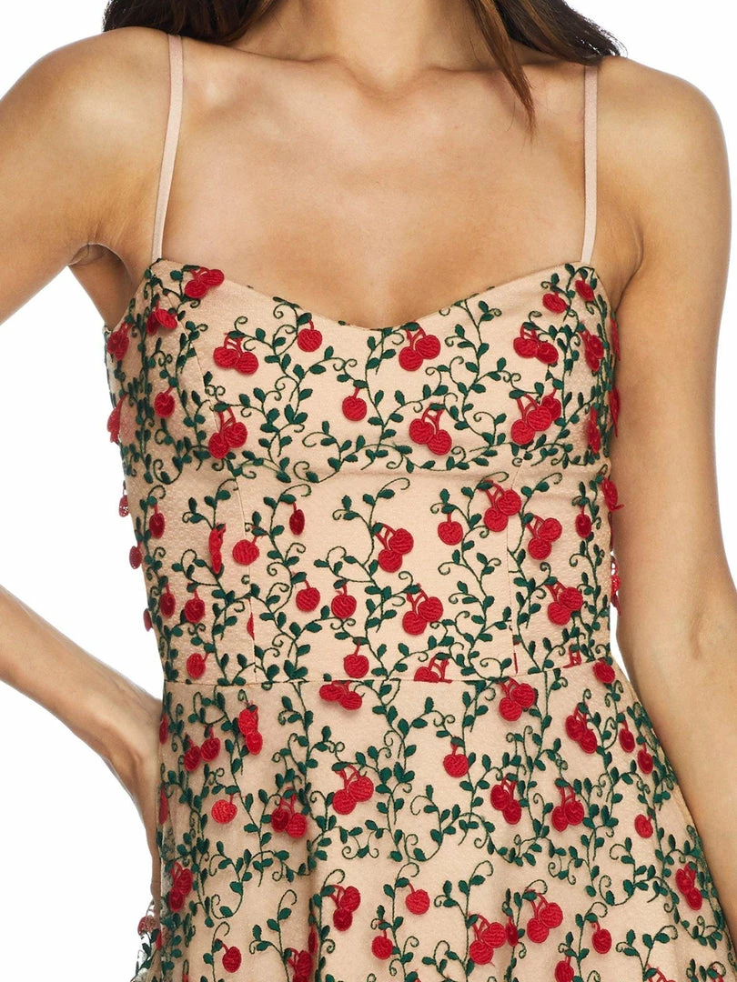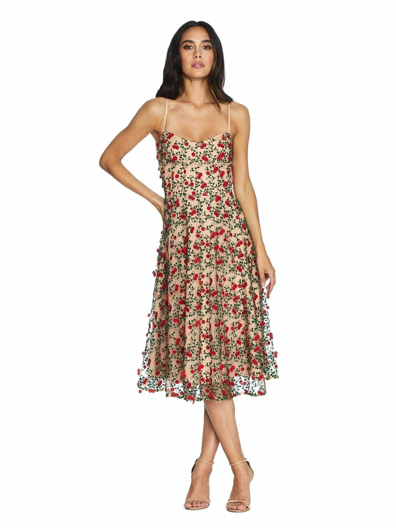 Beautiful embroidery adds to the playful romance of a twirly fit-and-flare dress in Rouge Red Multi that’s destined for attention on the dance floor or while strolling along the boardwalk.