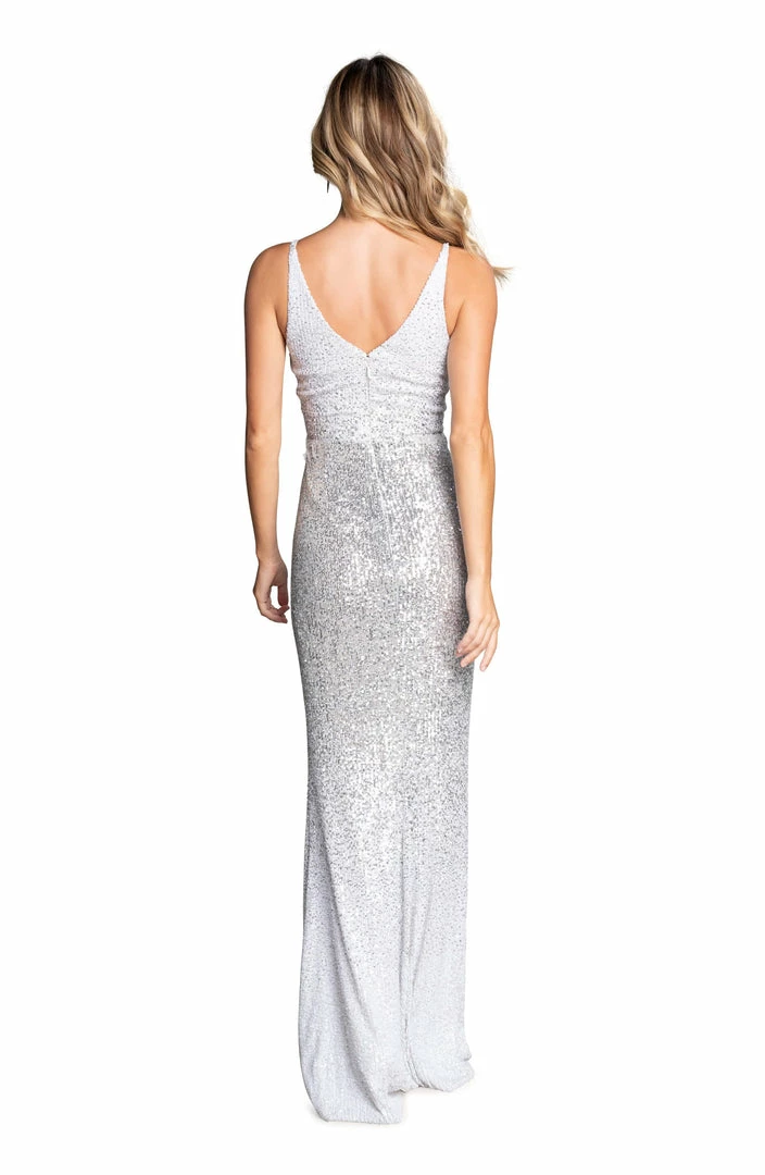 The Jordana Gown in White Silver is covered in dazzling sequins while the ombre and front side slit add flair. Featuring a fully lined bodice and center back zipper.