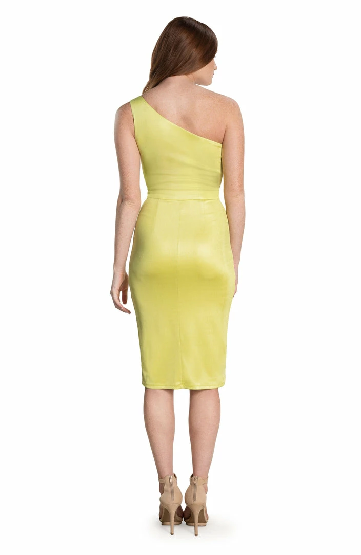 Asymmetrical neckline front slit bodycon midi dress.