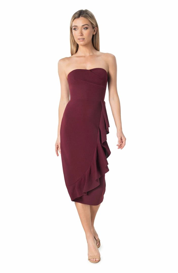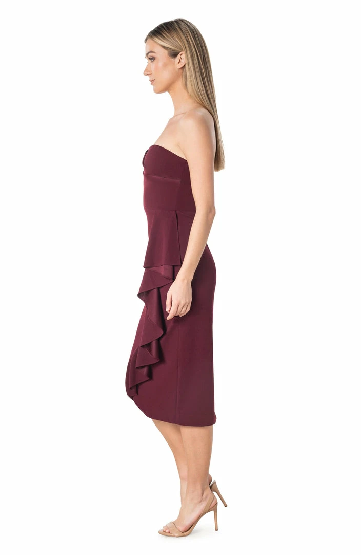 A twist on the classic bodycon midi dress. An asymmetrical strapless design featuring a pleated bodice and cascade ruffle. Ready for your next event.