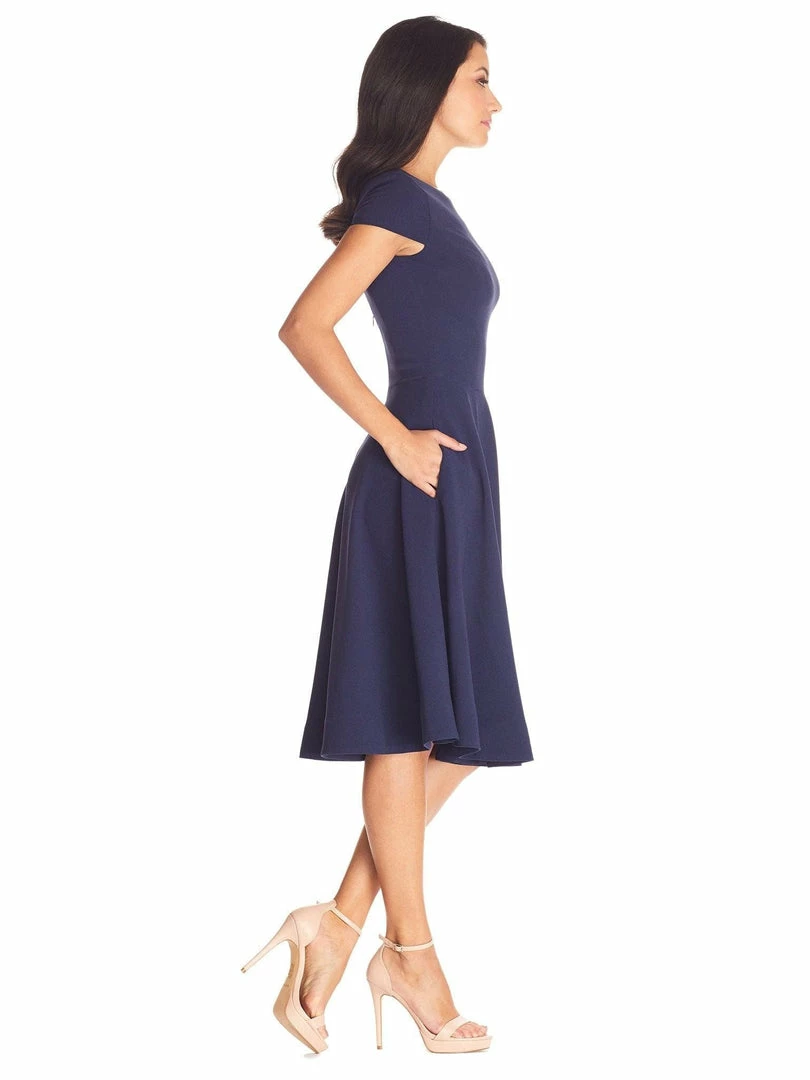 Keep things sophisticated when you style your look in the Livia dress in Midnight Blue. Featuring a high neckline, cap sleeves, a low scoop backline with a hidden zipper, and a fit and flare design. Livia’s practical design offers pockets, as well as a mid-length hemline that gives an effortlessly chic finish.