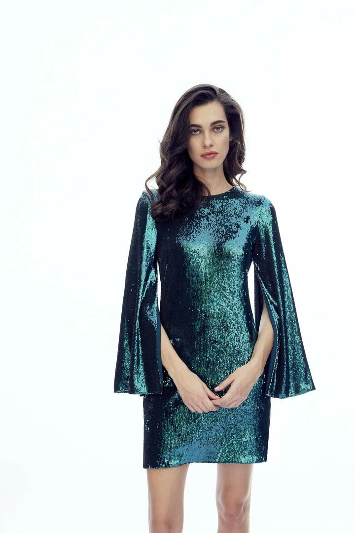 Dramatic cape sleeves frame the leggy silhouette of this evening-ready mini dress in Deep Emerald illuminated with the liquid shine of allover sequins.