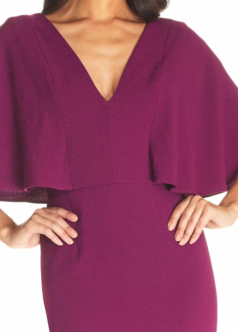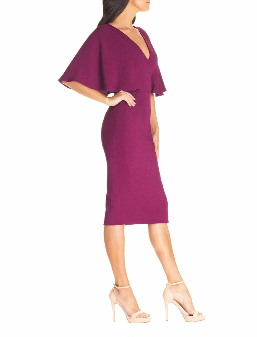 This cocktail attire ready dress in Dark Magenta features a deep v-neck and (even deeper square back) with a pencil skirt and butterfly sleeves.
