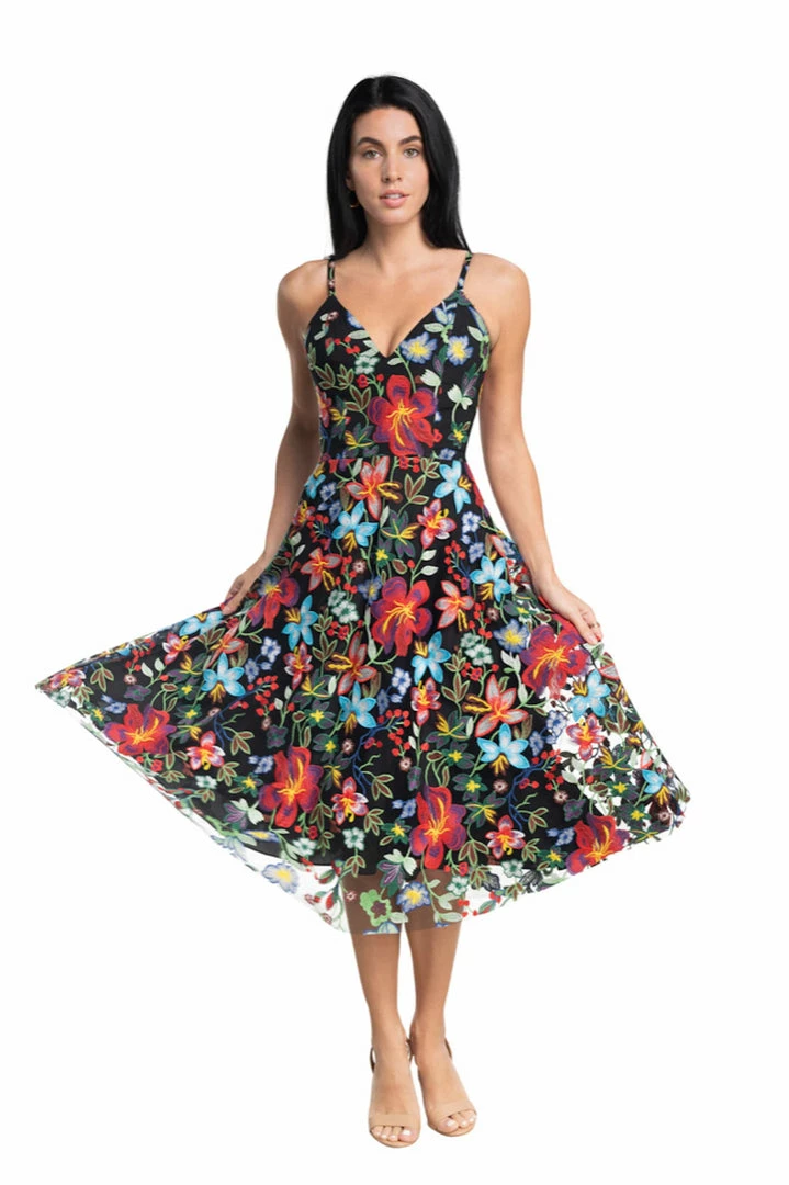 A lush garden scene is embroidered all over this figure-flattering dress in Black Multi topped with a slim, plunging bodice and finished with a breezy, flared skirt.