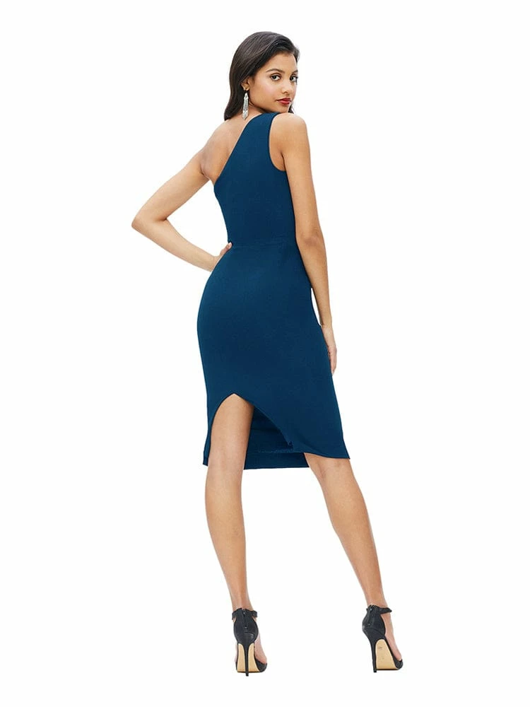 Fit to flatter, this stretch crepe sheath in Peacock Blue boasts a flirty one-shoulder neckline that’s sure to draw every eye in the room and hold them all night.