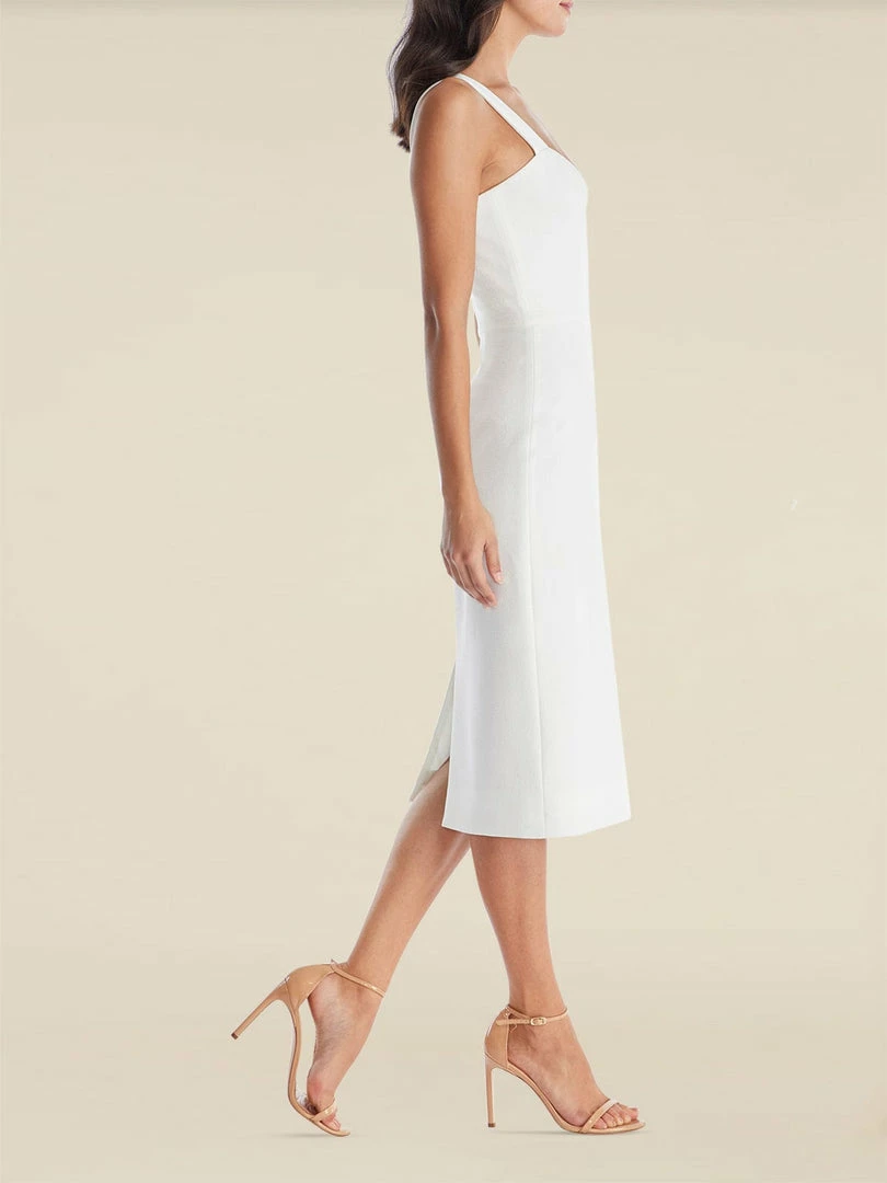 The Nicole sheath cocktail dress stuns every time. This fitted sleeveless dress has a modern silhouette that features a sweetheart neckline, square back, and a slit in the back of the cocktail-length skirt. It’s made of flattering crepe fabric in Off White.