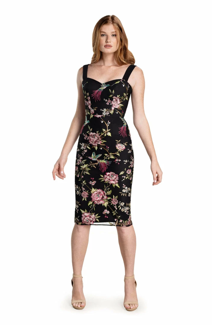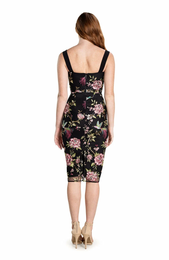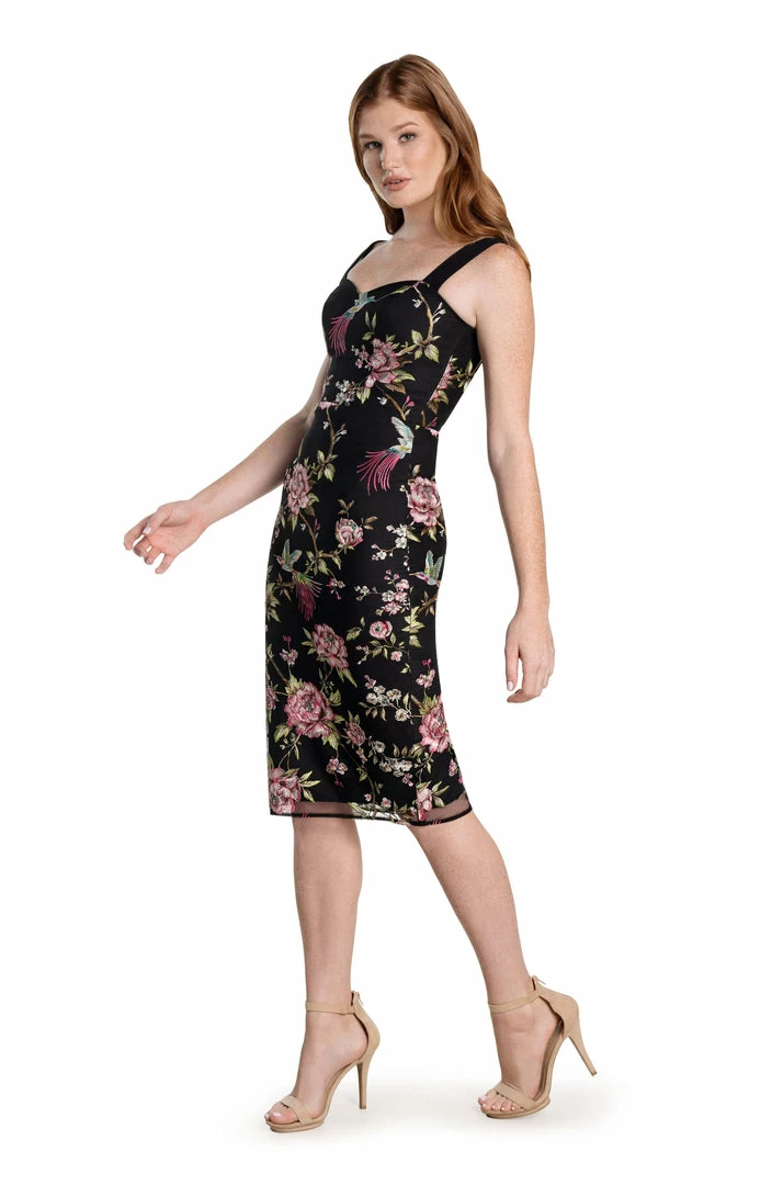 The Nicole sheath cocktail dress stuns every time. This fitted sleeveless dress has a modern silhouette that features a sweetheart neckline, square back, and a slit in the back of the cocktail-length skirt. It’s made of flattering tulle embroidered fabric with no stretch