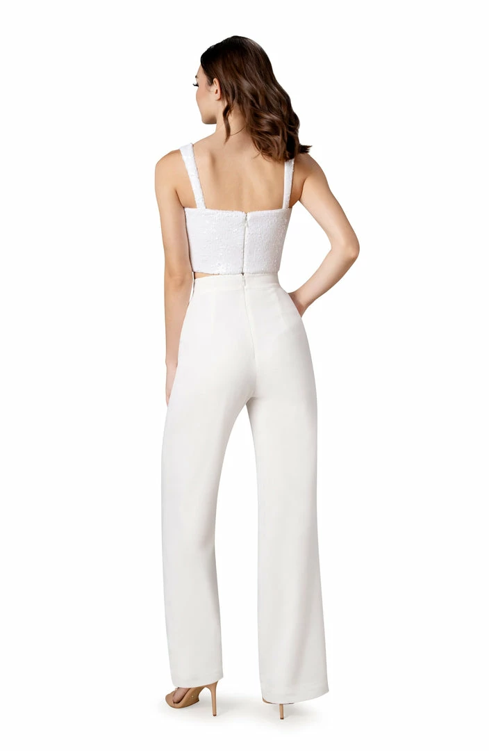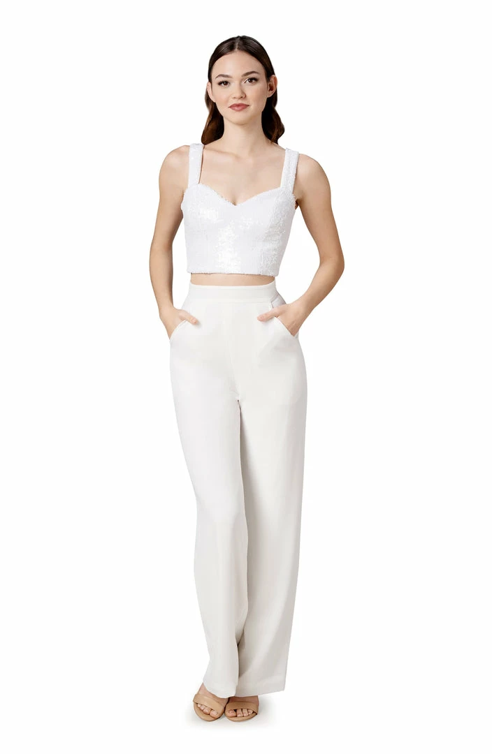 Two for one! Our perfect wide leg pant is paired with this luxe sequin crop top. The top is lined in knit lining for comfort.