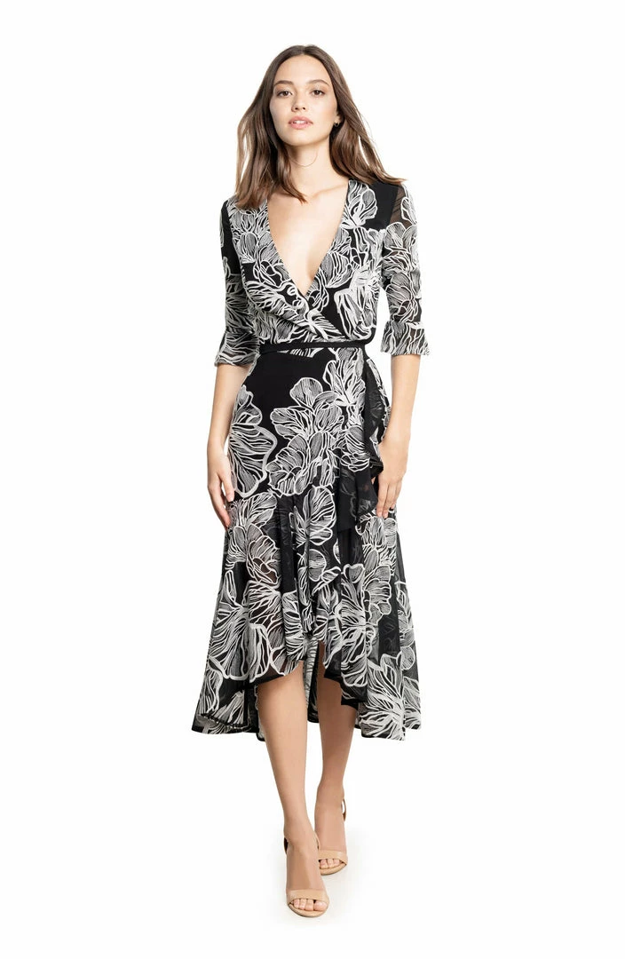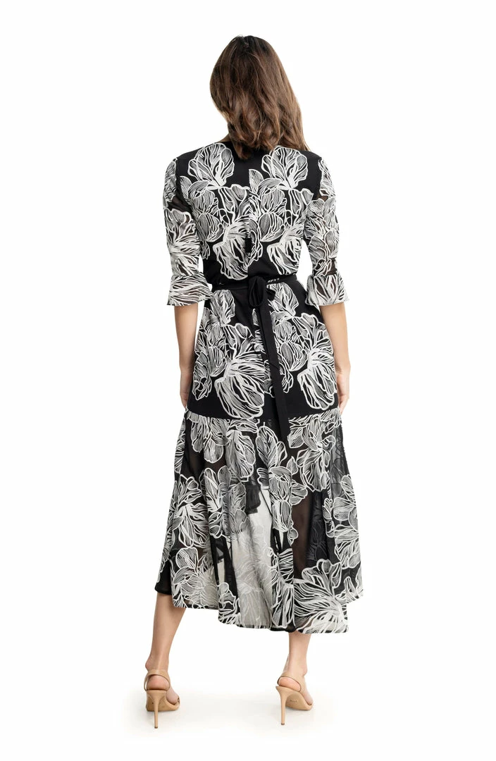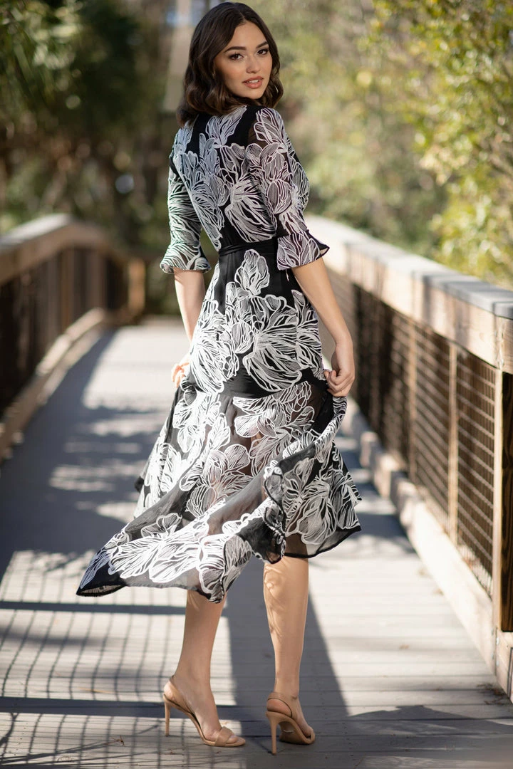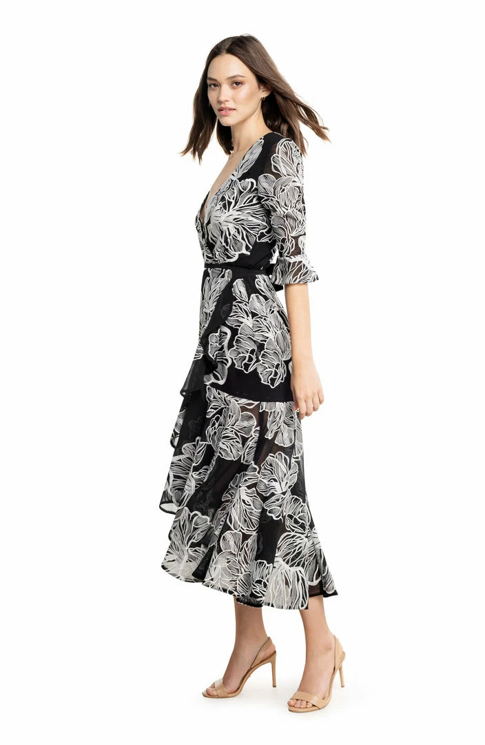 Embroidered flowers stand out in bright white on an sophisticated midi dress in a wrap-inspired silhouette with a twirl-accentuating high-low hem.