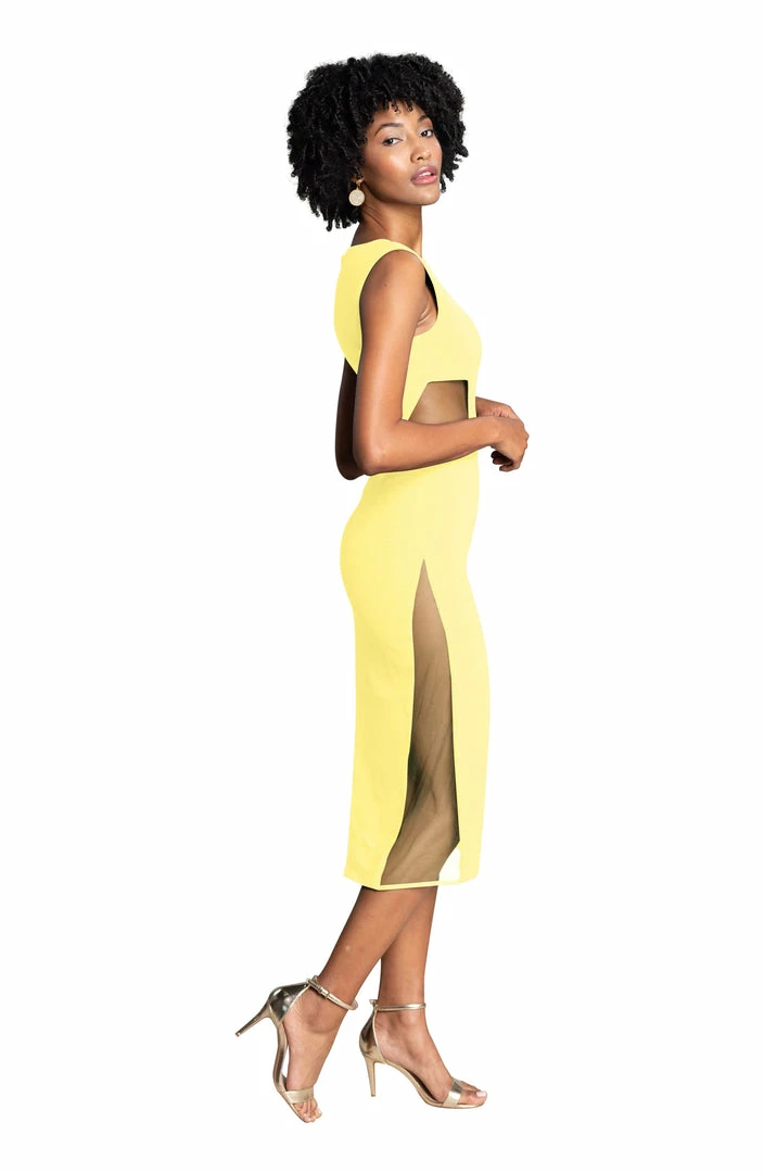 The perfect show of skin! The Bryson midi dress has mesh cut outs at the side leg and waist for a touch of sexiness to this perfect crepe dress