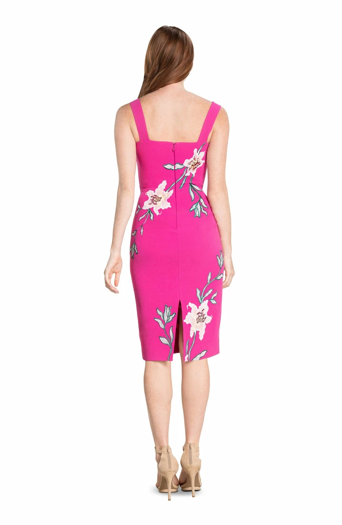 The Nicole sheath cocktail dress stuns every time. This fitted sleeveless dress has a modern silhouette that features a sweetheart neckline, square back, and a slit in the back of the cocktail-length skirt. It’s made of flattering crepe fabric with little to no stretch