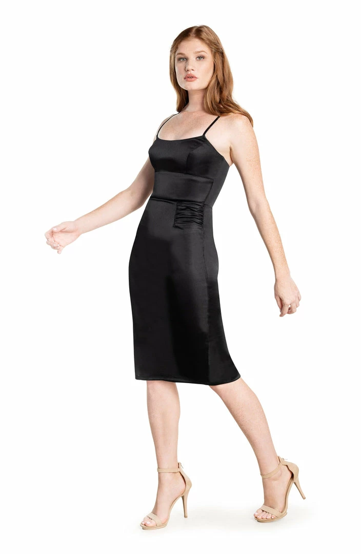 Silky stretch knit midi dress with a round plunge neck and side rouching darts