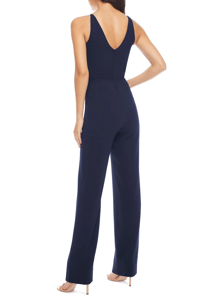 A drapey, ruched detail adds soft, asymmetrical structure to this breezy jumpsuit in Navy cut with wide flowing legs and a flirty double V-neck.