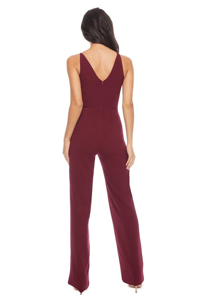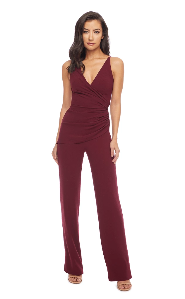 A drapey, ruched detail adds soft, asymmetrical structure to this breezy jumpsuit in Burgundy cut with wide flowing legs and a flirty double V-neck.