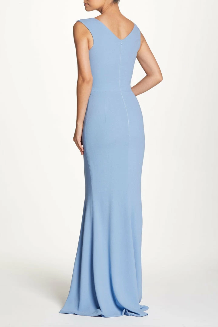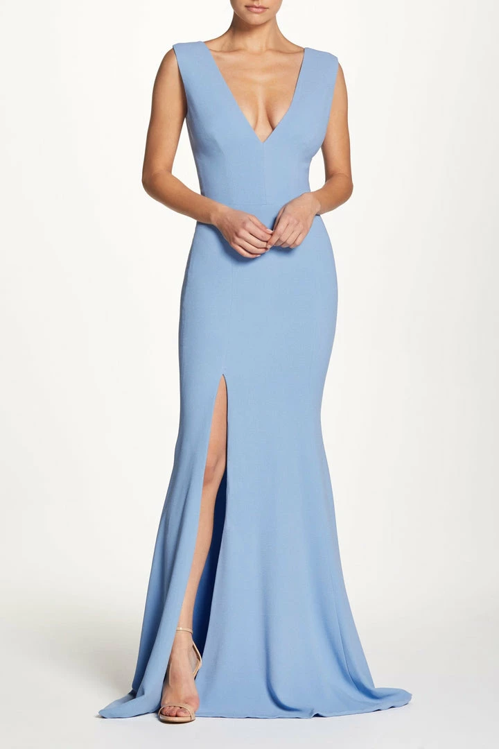 This striking floor-length style is made in our classic stretch-crepe in Ice Blue. This sleeveless mermaid gown fits snuggly through the torso and hips and has a subtly flared skirt. It features a plunging v-neckline, curved v-back, and a thigh-high side slit.