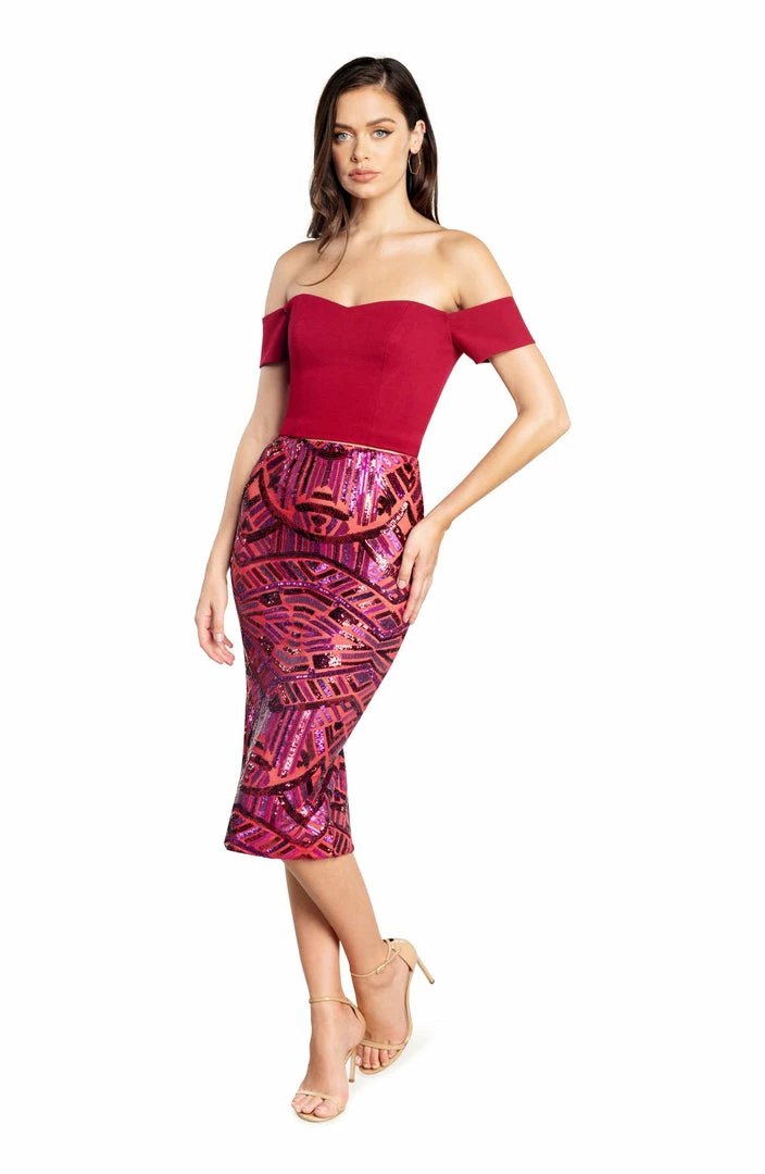 Introducing you’re the Nola skirt, we’ve taken our best selling Emery dress and made the perfect pencil skirt. This sequin placement hugs the body and accentuates all of your curves! Pair with your favorite T-shirt of our Bailey bustier top to complete the look.