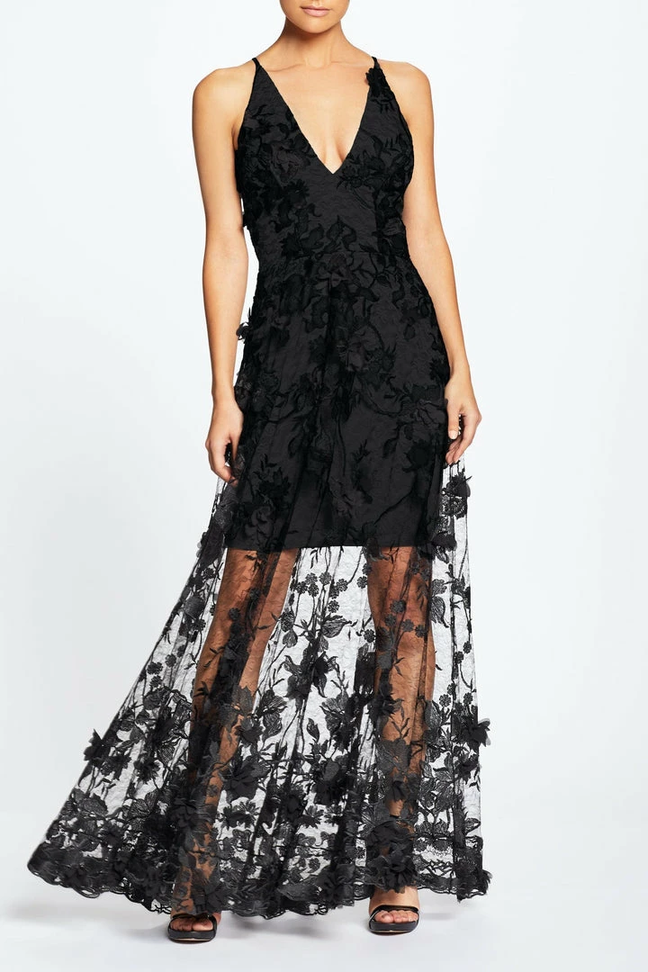 Fluttery appliqués in Black create a lovely 3D effect on a sleeveless A-line gown featuring a plunging décolleté neckline and a sweeping peekaboo skirt.
