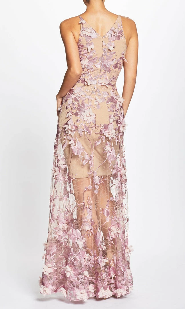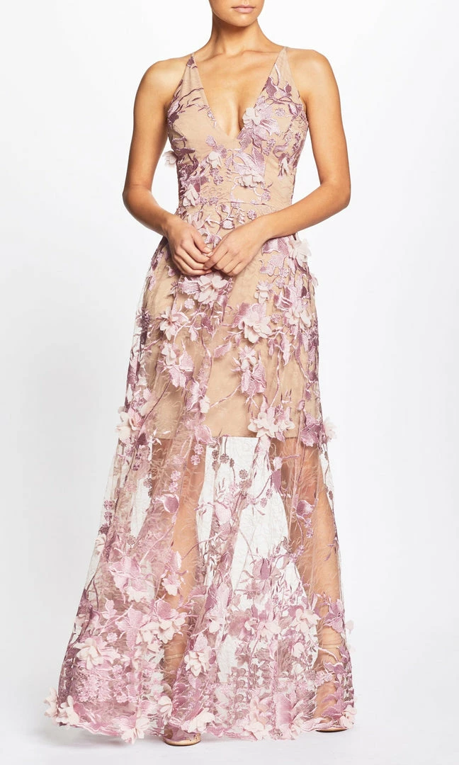 Fluttery appliqués in Lilac create a lovely 3D effect on a sleeveless A-line gown featuring a plunging décolleté neckline and a sweeping peekaboo skirt.