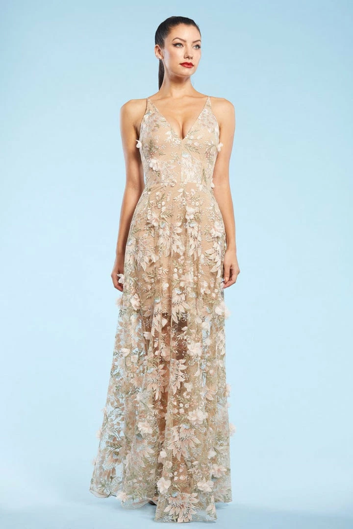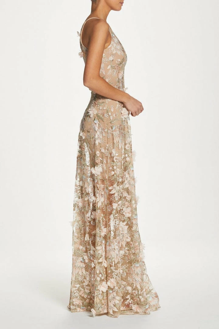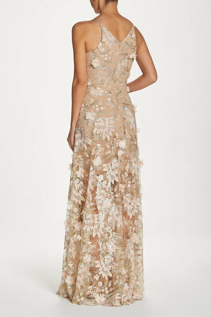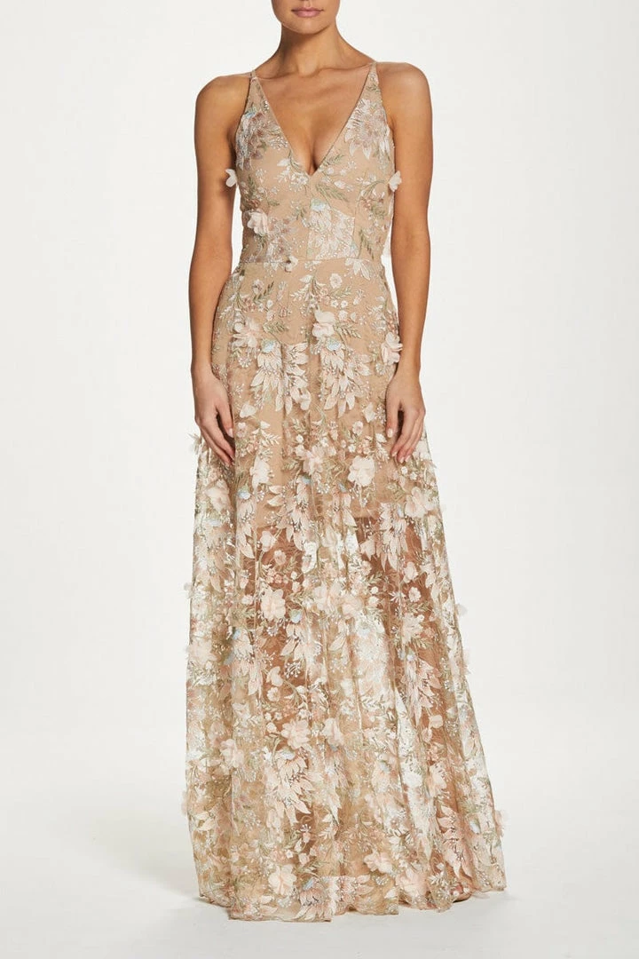 Fluttery appliqués in Pink create a lovely 3D effect on a sleeveless A-line gown featuring a plunging décolleté neckline and a sweeping peekaboo skirt.