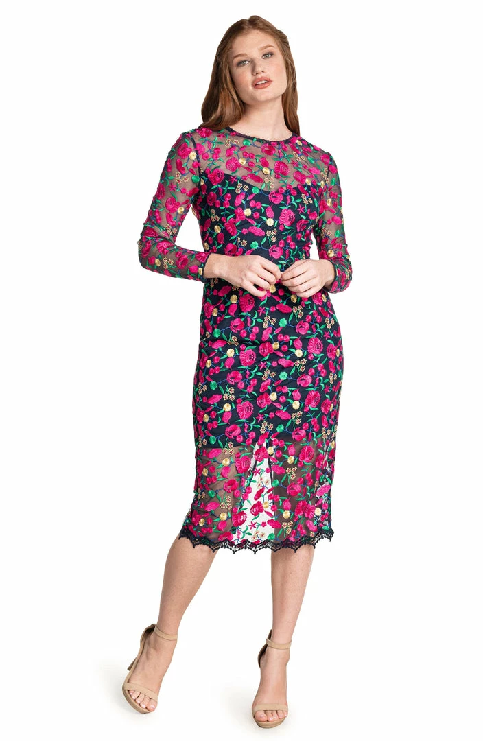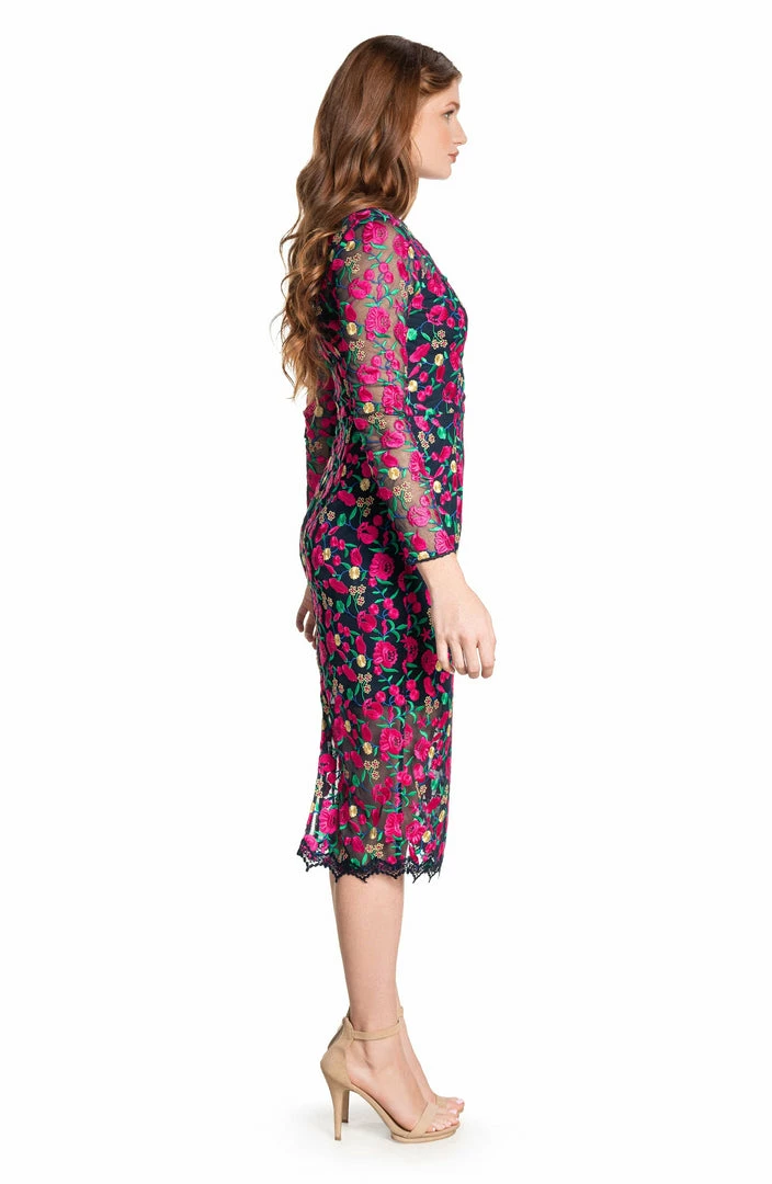 Long sleeve high-neck bodycon midi dress with sweetheart neck lining made of floral embroidery on tulle.