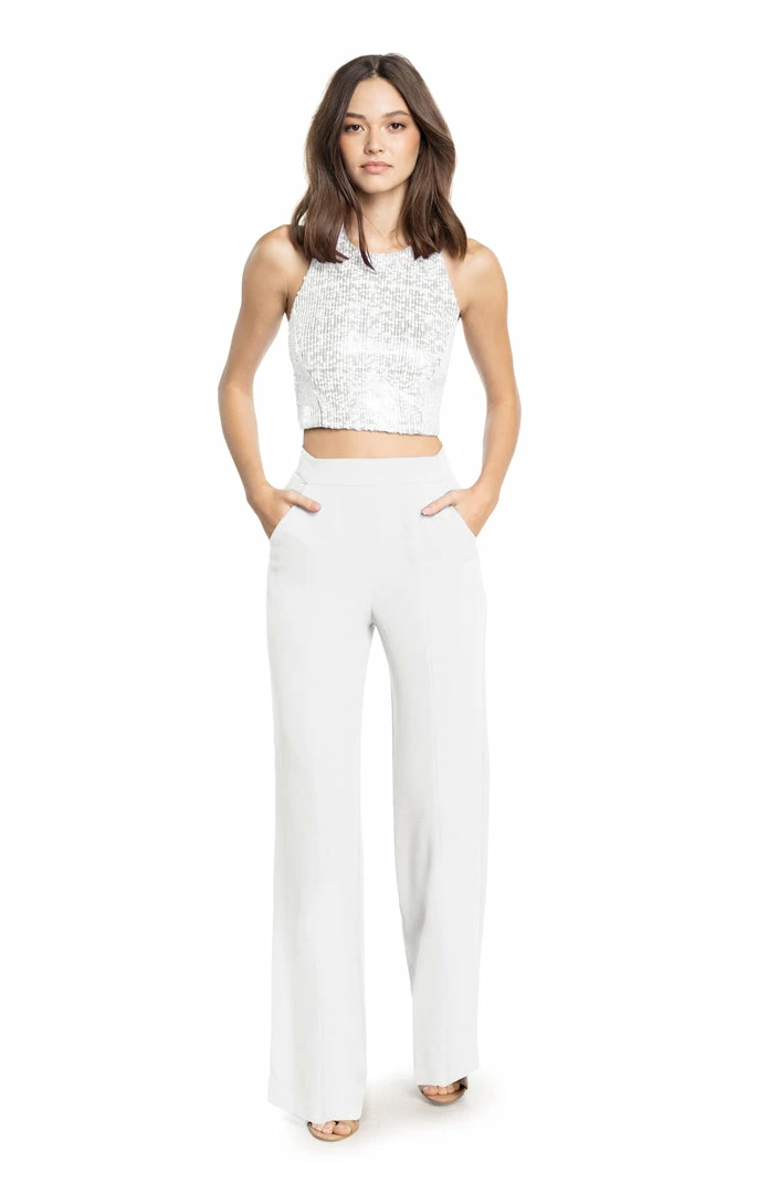 This two piece stunning set has a halter cropped sequin top paired with our classic wide leg crepe pant