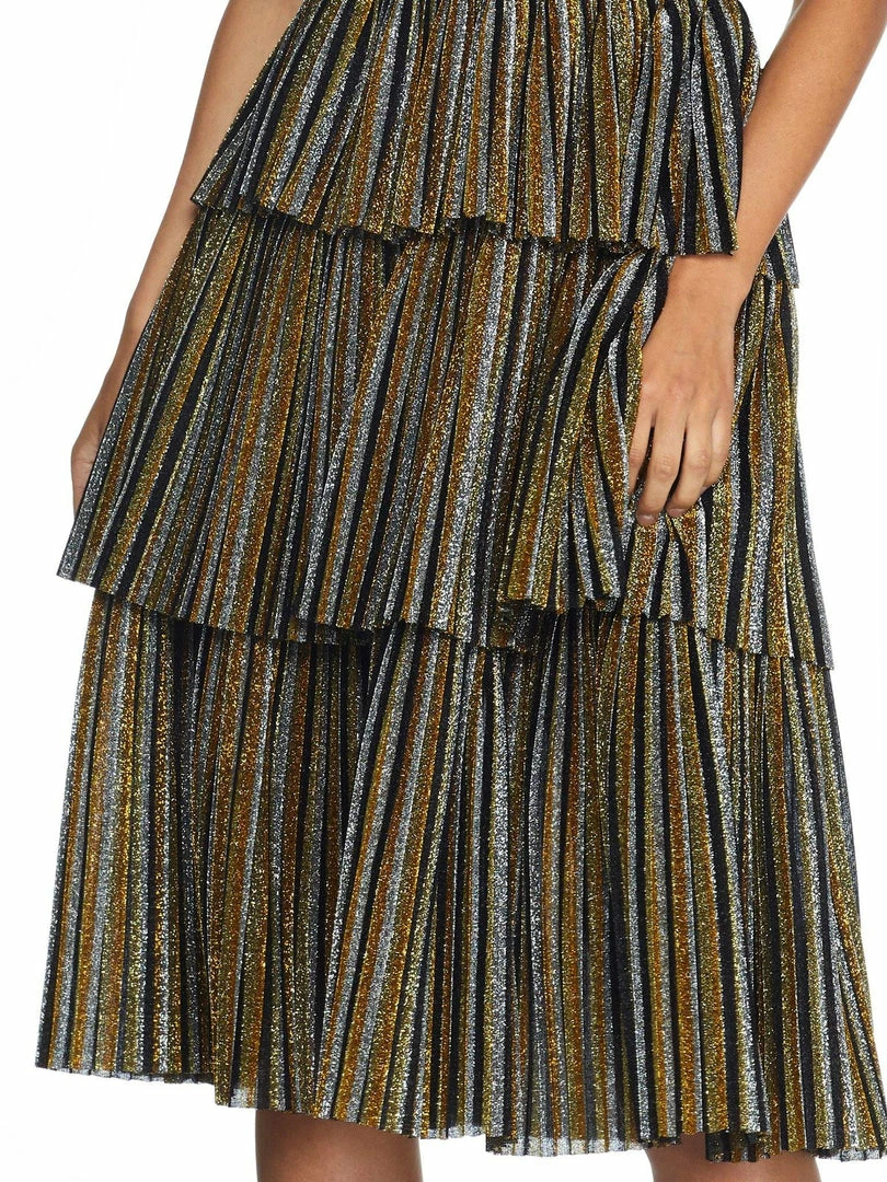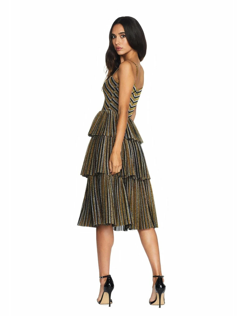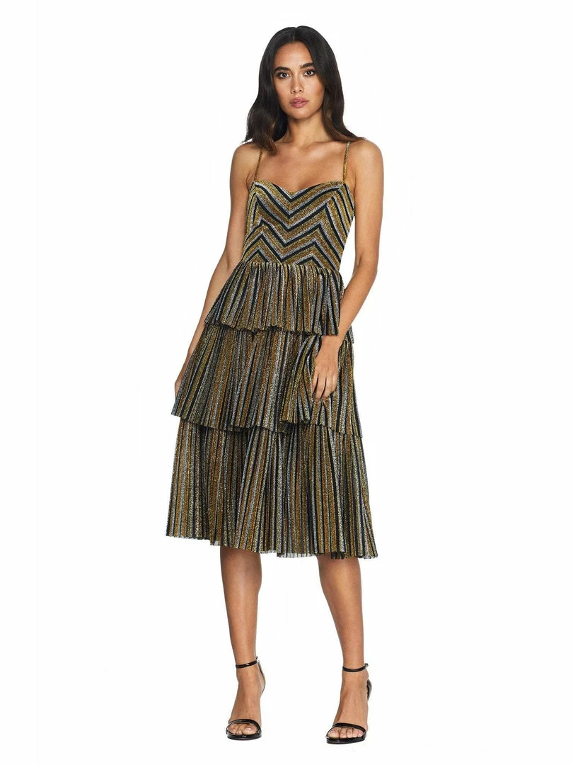All eyes will be on you in the Kathy dress in Gold Multi. Created with an exciting design, she features a sweetheart neckline, adjustable spaghetti straps, a hidden zipper center back, and a form fitting bodice. Her bodice meets skirt mid-waist to a flirty pleated triple tier design that finishes mid-length at the knee and features metallic chevron print.