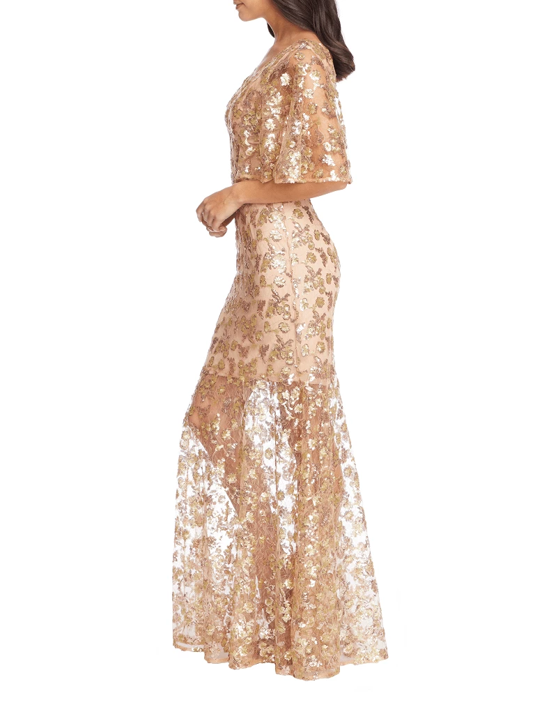 Tea rose sequin pattern with three-quarter sleeves and a low back