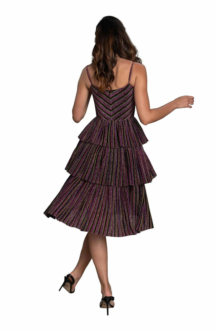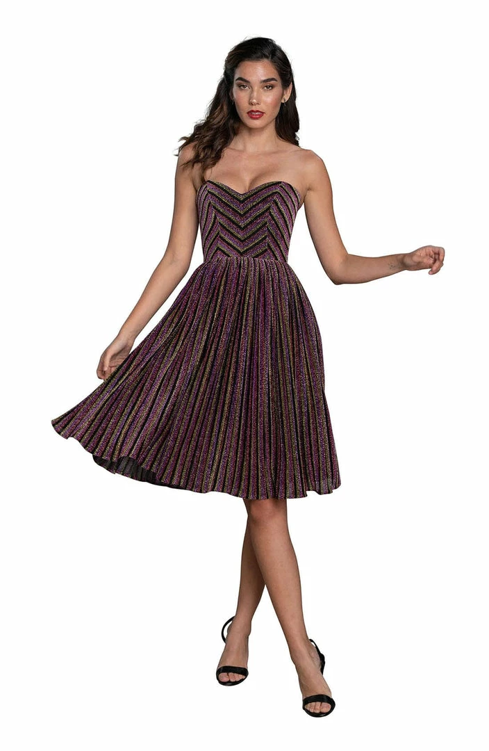 Created with a strapless sweetheart neckline, and a form-fitting bodice in Amethyst Multi that leads to a pleated midi skirt. Finishing touches are the star of the show with a colorful chevron pattern and metallic accents throughout!
