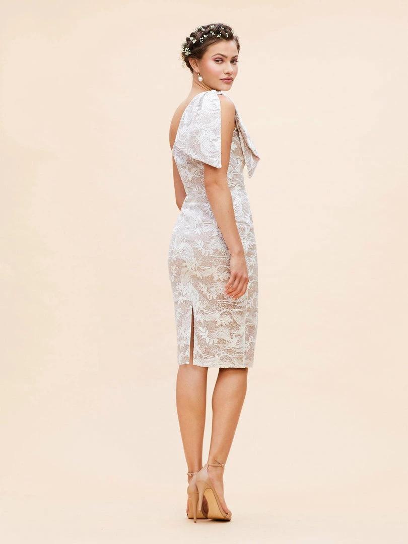 The Thalia has an asymmetrical one shoulder neckline with a drape detailing, a knee-length hemline, as well as a form fitting body-con silhouette. The Thalia in White is adorned with a beautiful botanical embroidery detailing with subtle beading.