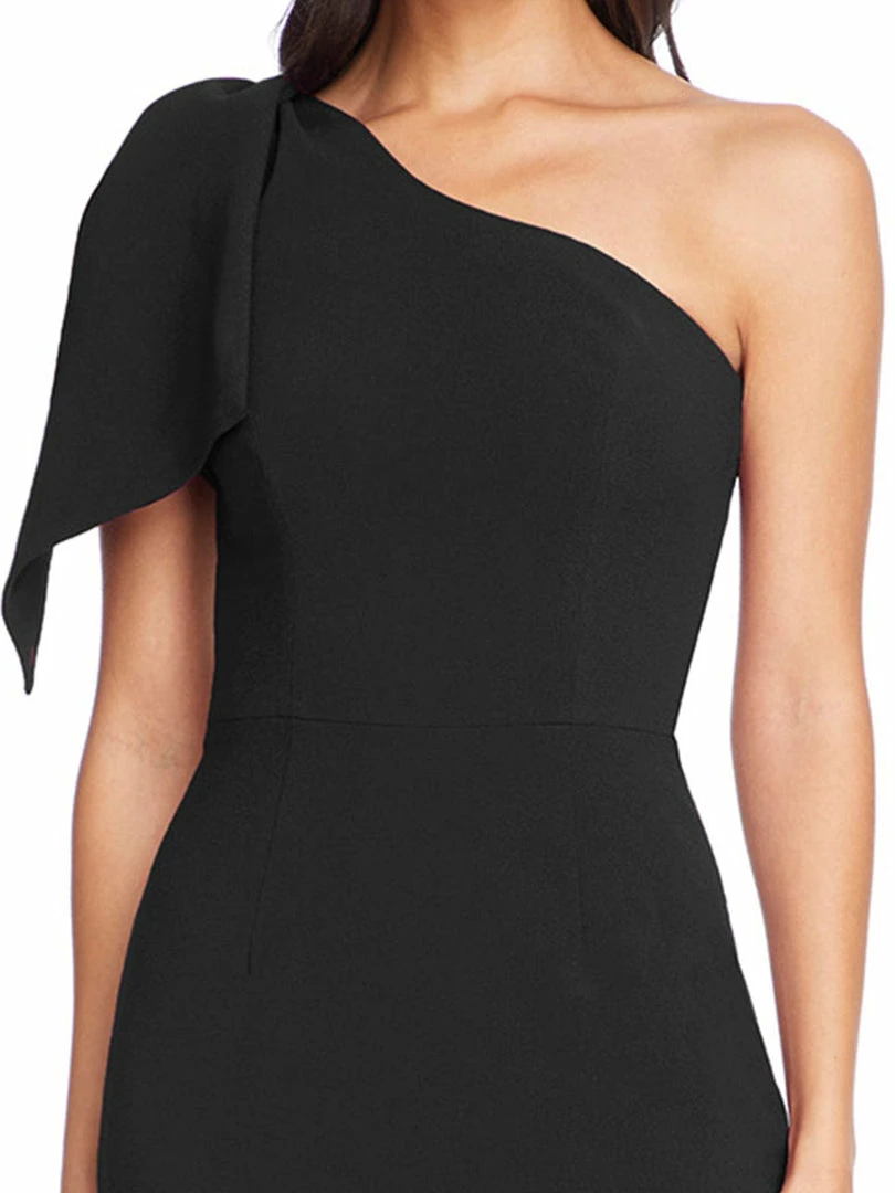 The Tiffany is an elegant asymmetrical dress made in our stretch crepe material in Black. A large bow drapes over the single shoulder strap. The form-fitting silhouette has a straight, midi-length skirt that tapers in at the waist completed with a back slit.