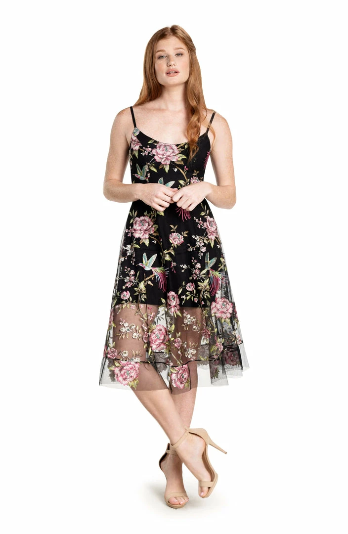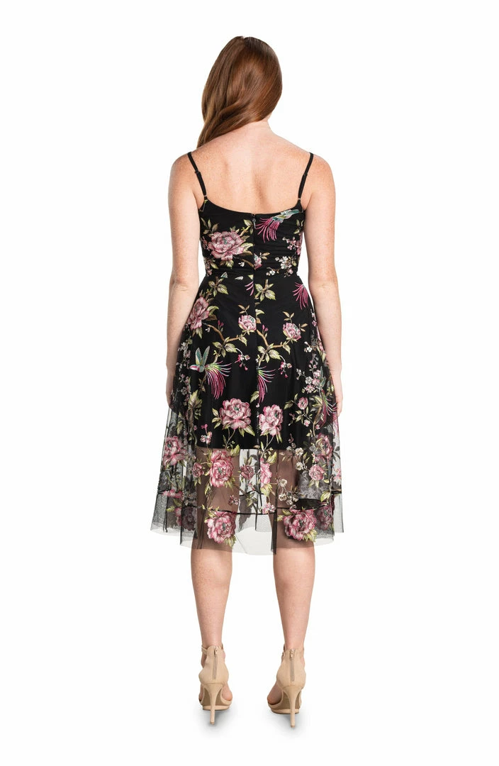 Sweetheart neckline fit and flare floral embroidery midi dress.