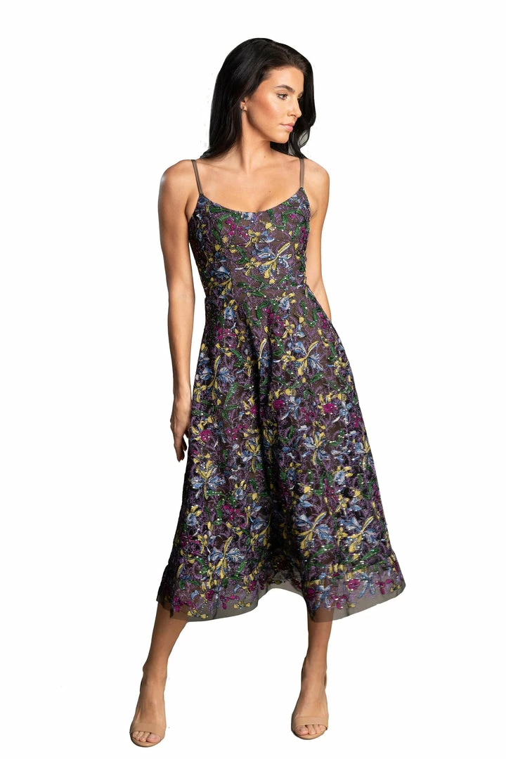 Scoop neck bodice with a midi fit and flare skirt. This fully embroidered dress has subtle sequins, is partially lined in a buttery soft stretch knit, with a sheer skirt.