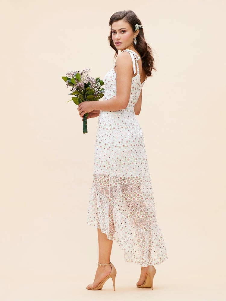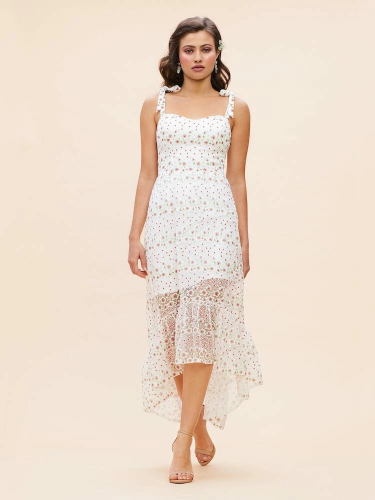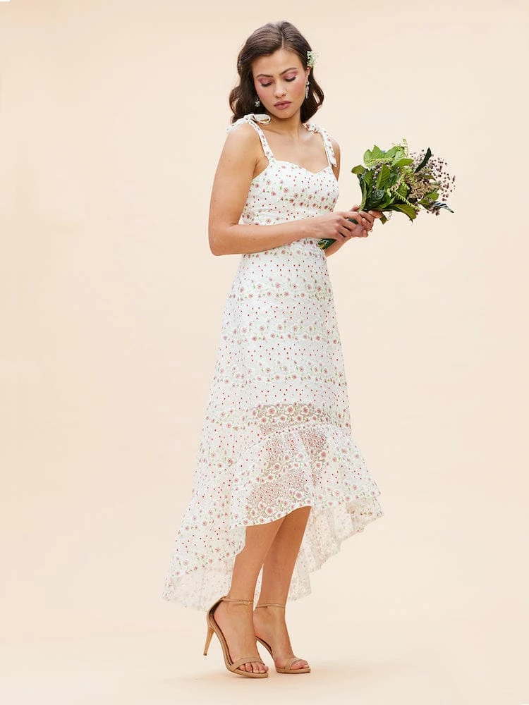 Prepare now for summery soiréss with this charming flower-and-dot dress styled with a sweetheart neckline, tie shoulder straps and an unlined high/low skirt.