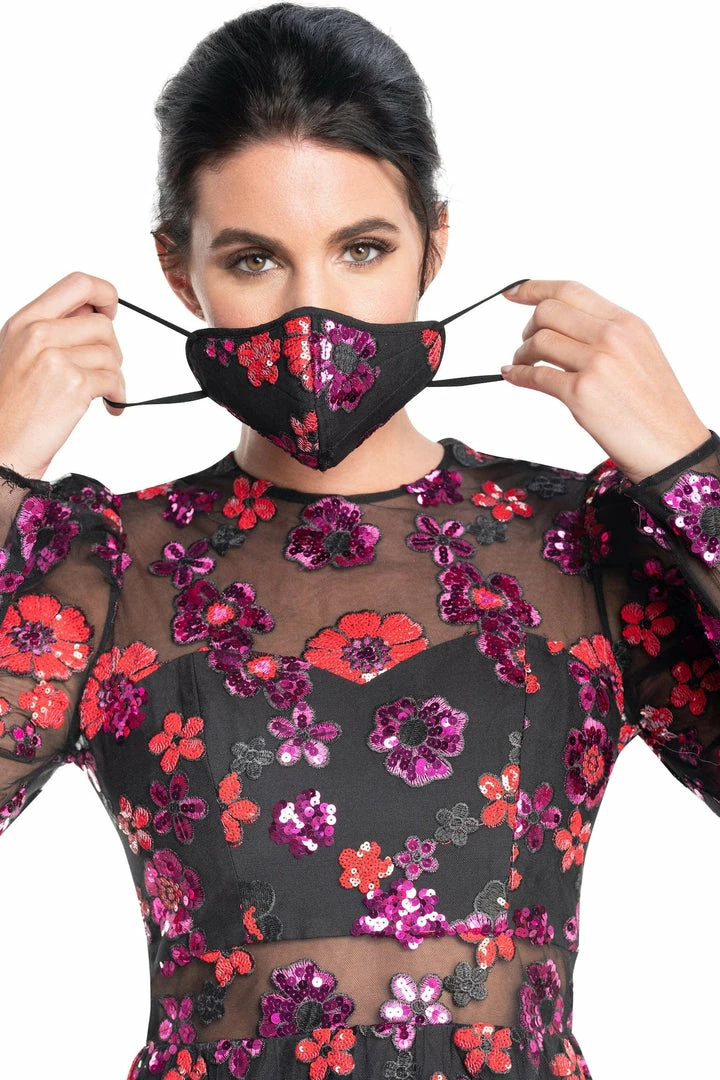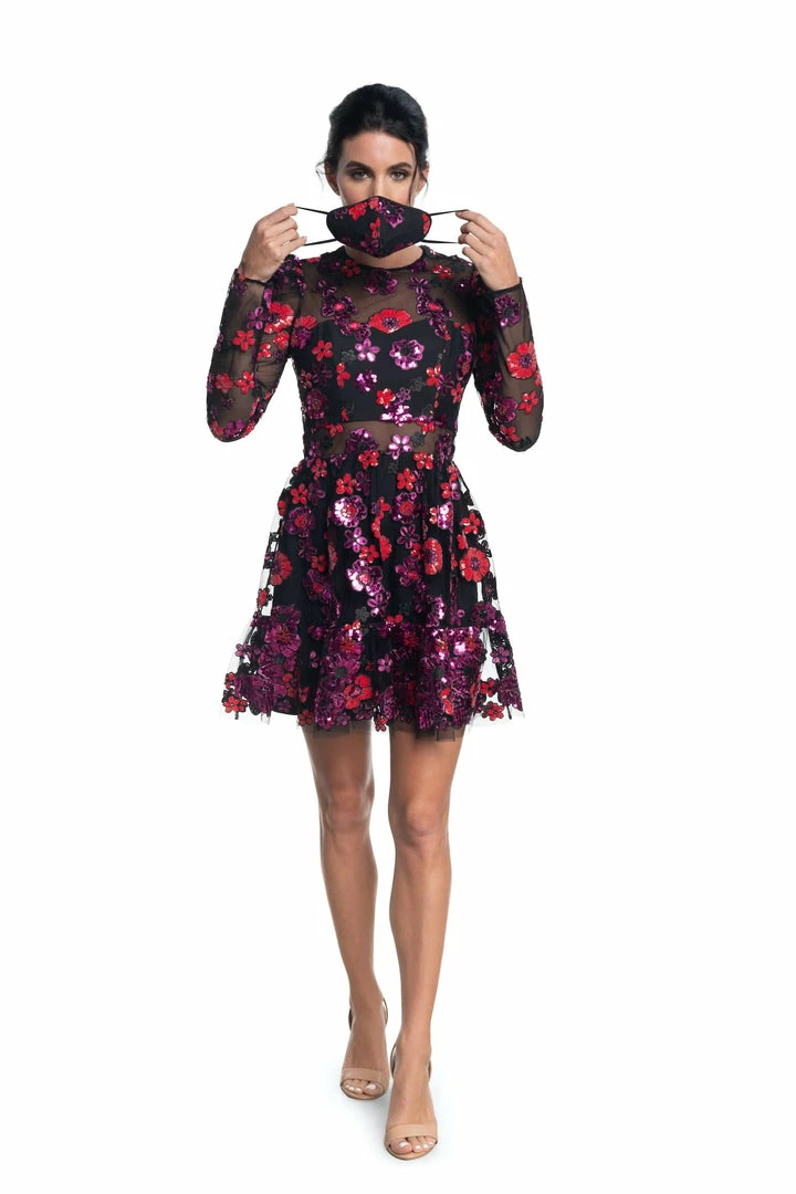 - Flirty fit and flare cocktail dress with long sleeves and vibrant floral embroidery and sequins throughout. Dress features a long puff sleeve and non stretch tulle